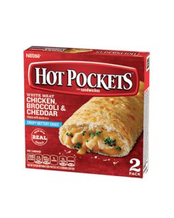 Hot Pockets White Meat Chicken, Broccoli & Cheddar Crispy Buttery Crust Frozen Snacks are a quick and easy choice for lunch or dinner. These Hot Pockets are made with white meat chicken, broccoli and cheddar cheese, wrapped in a delicious crispy buttery crust. This delightful frozen snack is a good source of protein, with 9 g of protein per serving, and delivers bold flavors that are great for anyone who loves the classic taste of broccoli and cheddar. Keep Hot Pockets White Meat Chicken, Broccoli & Cheddar Crispy Buttery Crust Frozen Snacks in the freezer until you're ready to cook.